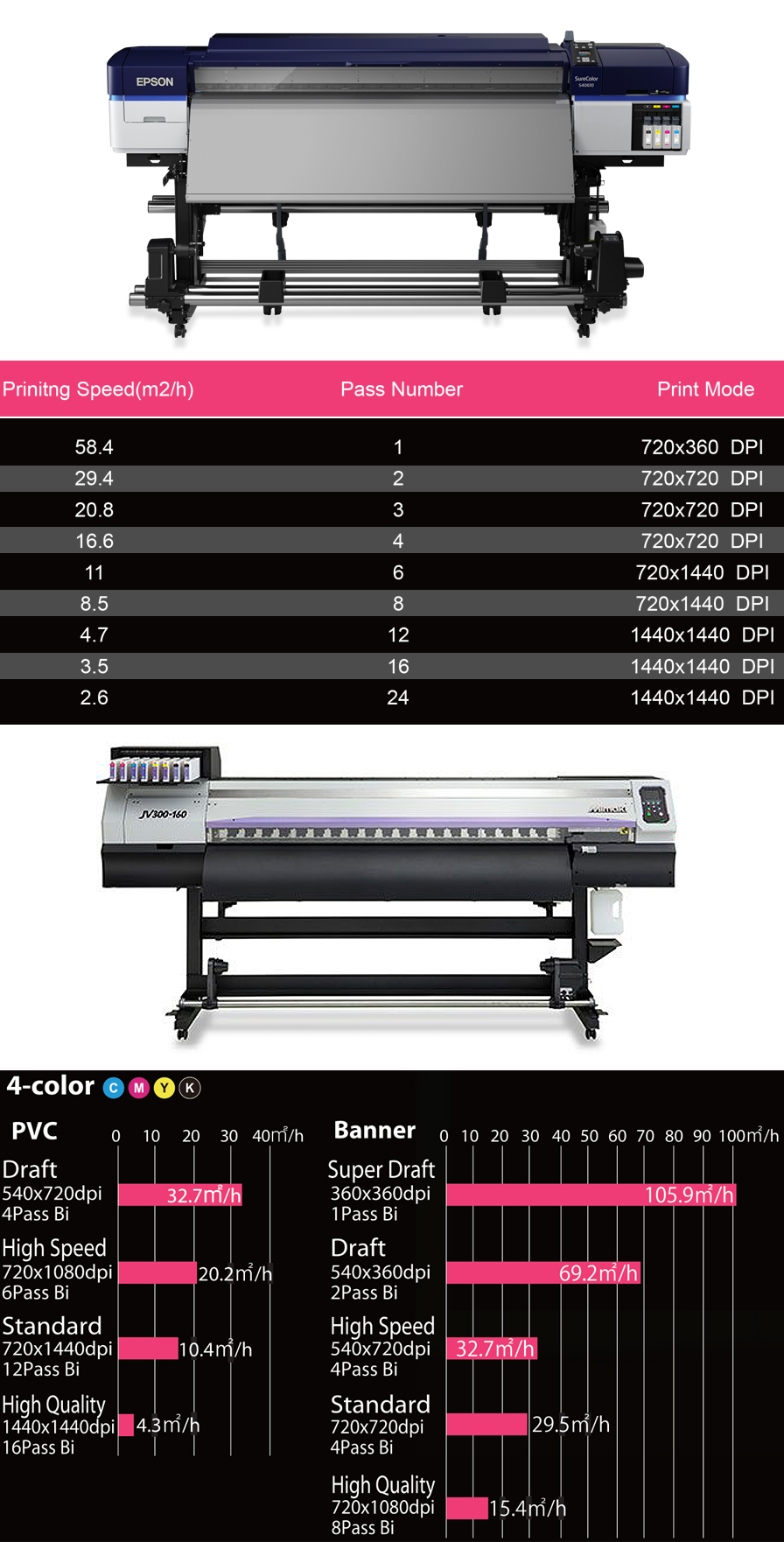 از آنجایی که دستگاه اکو سالونت میماکی JV300 با دو هد در کشور شتاخته شده هست، رقیب خوبی برای این دستگاه هست و ما برای مقایسه مود های چاپی، سرعت و رزولوشن اون رو با دستگاه اپسون S40600 مقایسه کردیم.قابل ذکر هست که خروجی اکو سالونت دستگاه میماکی در مود یک پس و دو پس در کشور ما کارایی ندارد و کاربرد اون از 4 پس به بالا هست . در مقایسه متوجه می شوید که خروجی اپسون ،با دوبرابر پس در دستگاه میماکی یکی هست.به عنوان مثال غلظت چاپ در 2 پس اپسونS40600 با 4 پس میماکی JV300 یکی هست.
